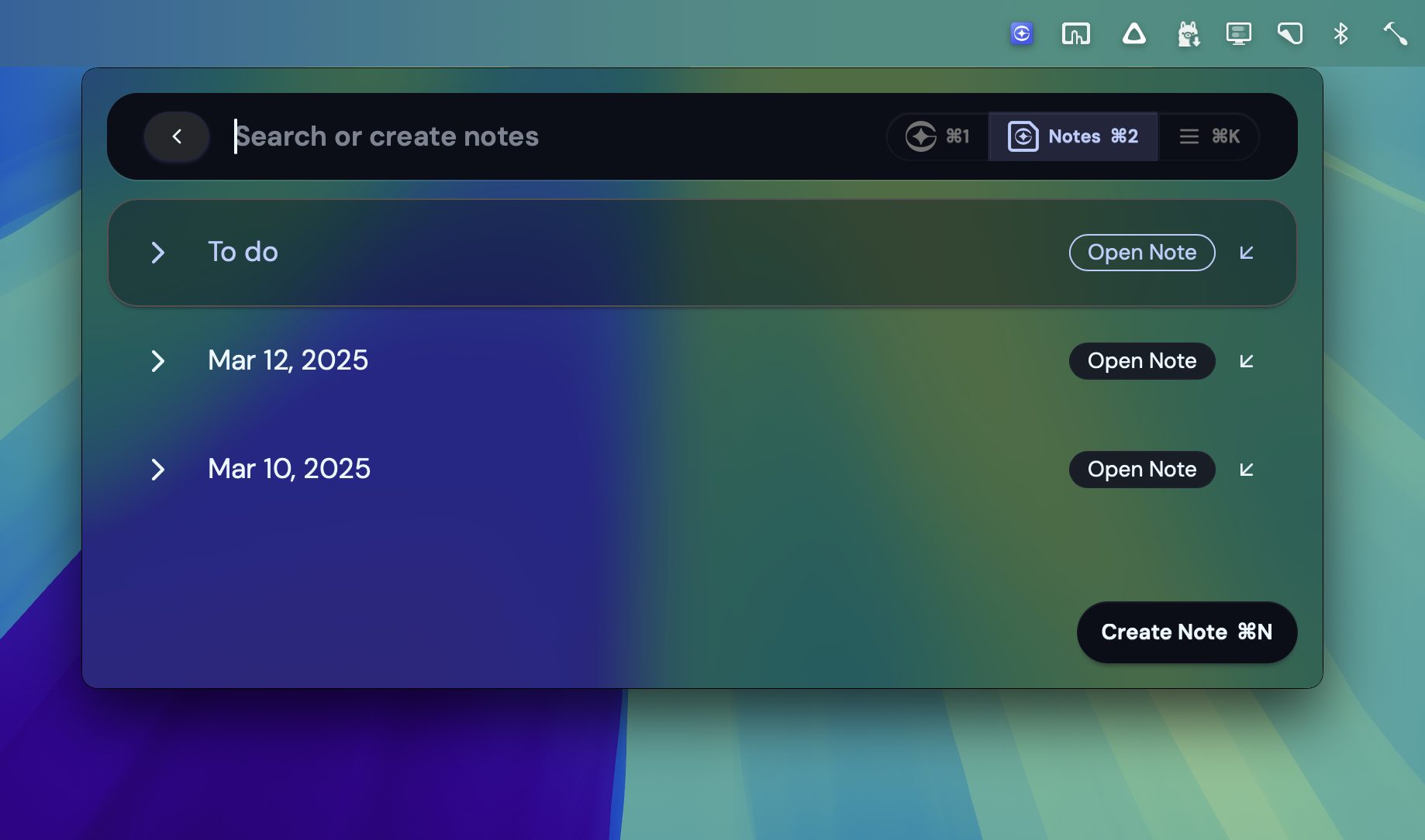 Section titled “Switching Modes”The application has two main modes: search and notes. You can switch between them using the Command+1 and Command+2 shortcuts.
